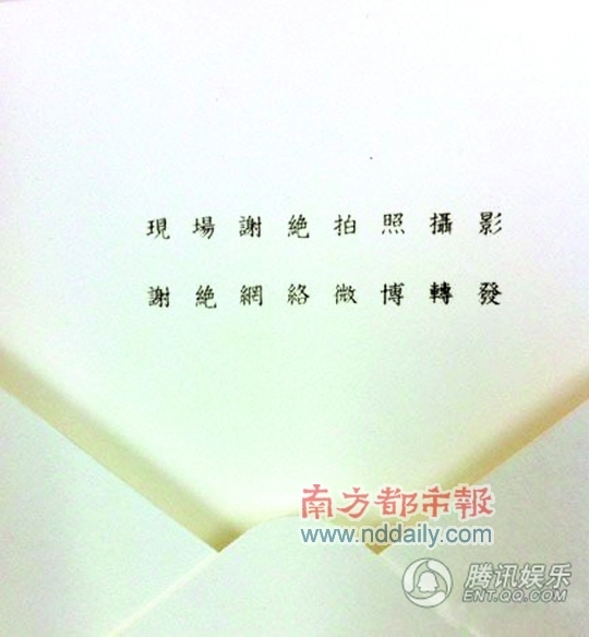 似曾相識的是,在喜帖中有這么一句:“現場謝絕拍照攝影,謝絕網絡微博轉發。”難道鄧超和孫儷也要效仿汪小菲和大S搞所謂的“低調”婚禮?不過,自兩人婚期被曝光以來,雙方的經紀公司就一直公開表示,婚禮不僅會對媒體報道敞開,還會邀請媒體朋友作為觀禮嘉賓,只是不能直播婚禮內場而已。希望這次的D S婚能好好吸取一下W S婚的經驗教訓,千萬不要顧此失彼啊。
