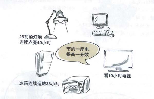 經過專業(yè)測算,每節(jié)約1 度電,相應可節(jié)省大約 400 克標準煤、4 升水,減少排放大約272 克粉塵、997 克二氧化碳、30 克二氧化硫、15 克氮氧化物等污染 物。節(jié)能空調每小時少耗電0.24度,節(jié)能冰箱每年省 電約100度,節(jié)能洗衣機用電少一半,節(jié)水約4成。