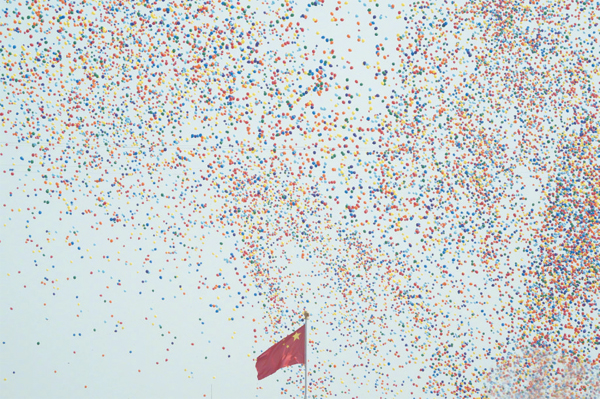 7 萬羽和平鴿展翅高飛,7萬只氣球騰空而起,伴著《歌唱祖國》的激昂旋律,慶祝大會圓滿結束。