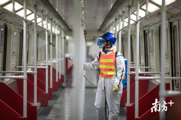 2月7日凌晨,廣州地鐵西塱車輛段,全副武裝的工作人員在列車車廂進行消毒。