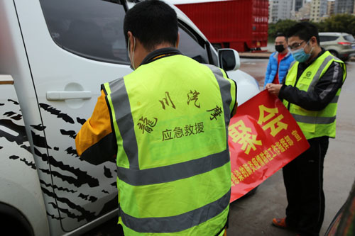 自駕越野車上插上隊旗、裝上喇叭器、調(diào)試音量、張貼標語、列隊前行……當天上午9點左右,20多名身著“龍川汽摩應(yīng)急救援”、戴著口罩的熱心志愿者,為了此次車載廣播公益宣傳工作做準備。之后,醒目的紅色標語和播放著客家山歌、快板廣播的車隊兵分幾路分組從縣城沿江路出發(fā),一路上播放著疫情防控提醒知識的山歌、快板等。
