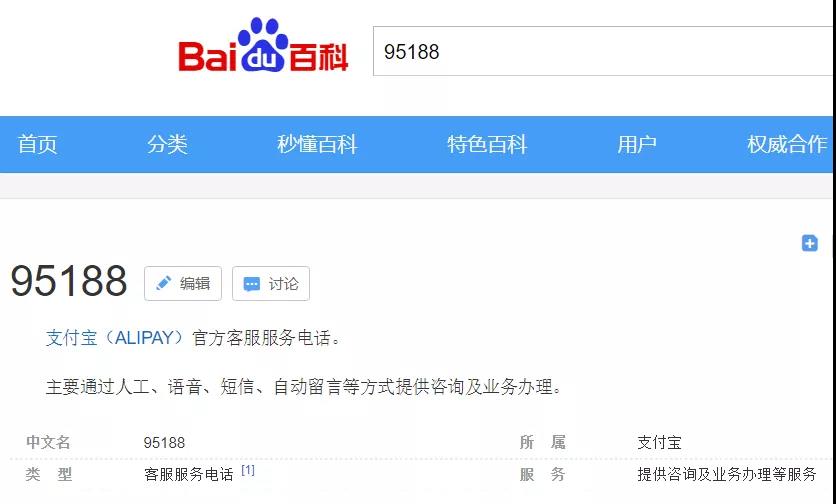 這次受騙者收到的是冒充“95188”發送的短信,通過搜索發現這個號碼確實是支付寶官方客服服務電話