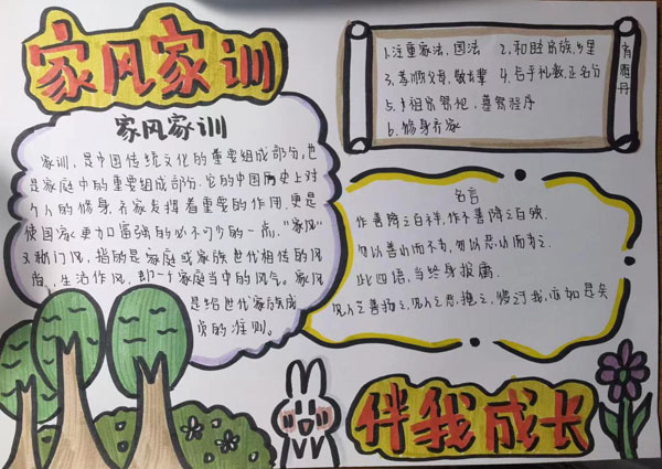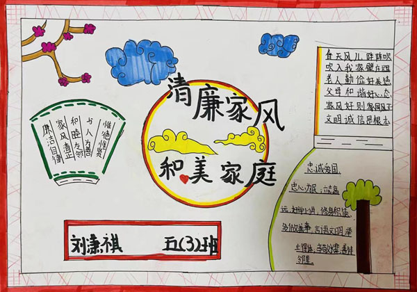與此同時(shí),該校五年級(jí)開展了以“傳承好家風(fēng) 踐行好家訓(xùn)”為主題的手抄報(bào)設(shè)計(jì)活動(dòng)。一幅幅手抄報(bào)圖文并茂、主題突出、構(gòu)思精巧、色彩鮮艷。同學(xué)們用自己的巧手繪制崇廉尚德的家風(fēng)家訓(xùn)作品,展現(xiàn)了自己對(duì)于“家風(fēng)、家訓(xùn)”的深刻理解,讓家風(fēng)家訓(xùn)入腦、入眼、入心。